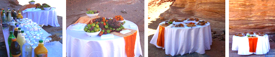 פיתות, לימונדה ומים קרים. לקינוח תה מצמחי מדבר ועוגיות. הגשה במזנון
