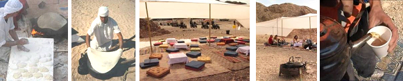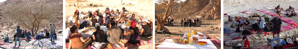 פיתות, לימונדה ומים קרים. לקינוח תה מצמחי מדבר ועוגיות. הגשה במזנון